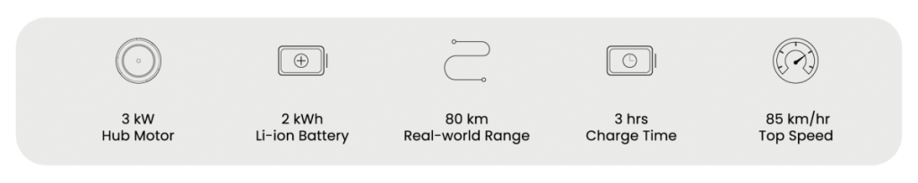The bike comes equipped with a 2-kilowatt-hour, 28-Ah, 72V battery that offers a range of approximately 80 km on a single charge in regular traffic conditions. This is the minimum range, with the potential to reach up to 90-100 km under more efficient riding conditions. The battery takes about 3 hours to fully charge, and it costs around Rs. 10 for a complete charge, offering excellent cost-efficiency for daily riders.
