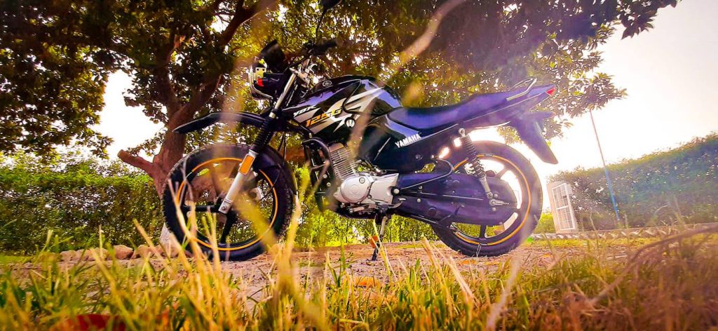 Chassis, Suspension and tires: YBR 125 G has a diamond frame which is very well balanced, bike also comes with telescopic front forks which are covered with Fork Boots to protect them in Off Road conditions provide good damping, on the rear it has swing arm based dual shocks suspension setup which is adjustable up to 5 steps for pre-load. YBR 125 G has 18-inch aluminum alloys with Block pattern or Dual-purpose tires. These tires can be used on & off road. It uses a 3.00/18 F and 90/90 18 rear tire size. The breaking duties are performed by single piston caliper disc @ front and a drum break @ rear which provide adequate stopping power. This bike weighs 113 kgs and its weight is very well balanced, due to grippy tires, this bike is a charm to ride